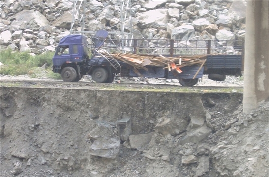 彭云:有天中午,我們從夾壁鄉(xiāng)衛(wèi)生院巡查完趕去另一個(gè)工地,兩個(gè)工地之間有一段未完工的317國(guó)道路基。受地震影響,道路遭受嚴(yán)重的破壞,兩邊山上時(shí)有滾石掉下。車在顛簸、搖晃中緩慢行駛,過了畢棚溝路口的小橋后是一個(gè)急轉(zhuǎn)彎。突然,前面從山上滾下一根木頭橫在車前,司機(jī)劉定峰大喊一聲“壞了!”,瞬間車子跳起來,劇烈搖晃,我下意識(shí)抱住了頭,身體在車內(nèi)左右撞擊,周圍的東西在搖晃,車在旋轉(zhuǎn),十幾秒鐘以后,一切戛然停止。我們又怔了十幾秒,“大家沒事吧?”我們異口同聲問道,我試著動(dòng)了動(dòng)四肢,沒受傷,其他人也都沒有受傷。在附近目睹這驚險(xiǎn)場(chǎng)面的工友們?nèi)颗苓^來拉我們出去。從車子里出來后,我們發(fā)現(xiàn)側(cè)翻車輛離河邊只有兩米!也要感謝劉定峰,在車摔到坑里前他死死的抓住方向盤,踩著剎車,避免了更大的險(xiǎn)情發(fā)生。