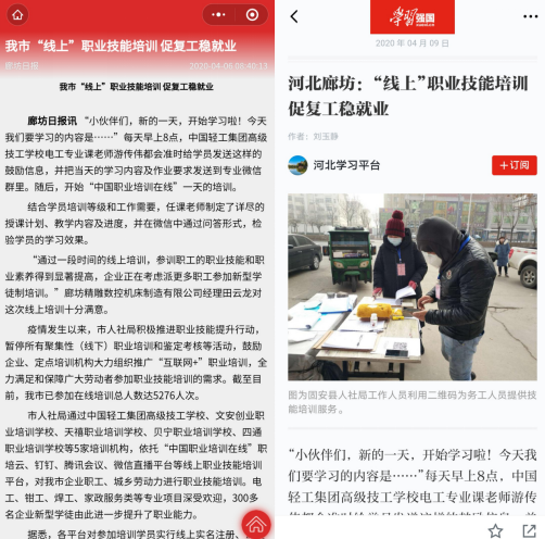 △“學(xué)習(xí)強(qiáng)國”河北學(xué)習(xí)平臺(tái)和《廊坊日報(bào)》分別對中國輕工集團(tuán)高級技工學(xué)校 “開展企業(yè)新型學(xué)徒制線上教學(xué),助力復(fù)工復(fù)產(chǎn)、穩(wěn)就業(yè)”的情況進(jìn)行了相關(guān)報(bào)道